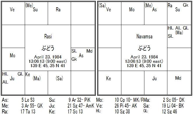 >>あと6室支配の土星がラグナロードにアスペクトしているので、病気にはやや注意ですかね・・・(これだけラグナロード強く、木星のアスペクトもあれば、よほど大丈夫だとは思いますが。)
