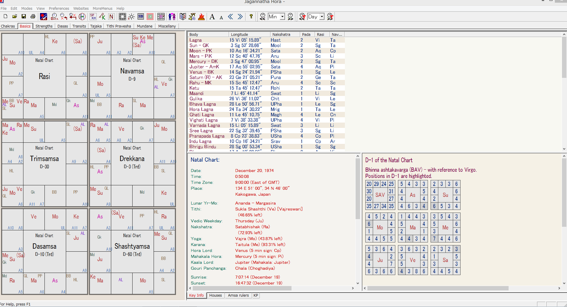 >ラーシ、ナヴァムシャ、ダシャムシャの10室支配星や6室支配星を、ラグナ、月、太陽から見ると、1室や4室が強調されています。