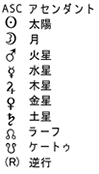 次に、占星術でよく使われる惑星の記号(左図)を用いて、ホロスコープを描き替えてみましょう。 |
