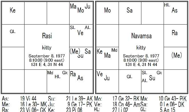 kittyさんのナヴァムシャのラグナは双子座と蟹座の境目に位置していまして、出生時刻が1分遅れると蟹座(ラーフのいる位置)に入ります。