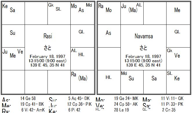 さとさんの4室は火星(かつ6L)・土星(かつ8L)・ラーフの三凶星の影響があり、ほぼ最大限に傷ついています。また4室の支配星も悩みの8室に入っています。