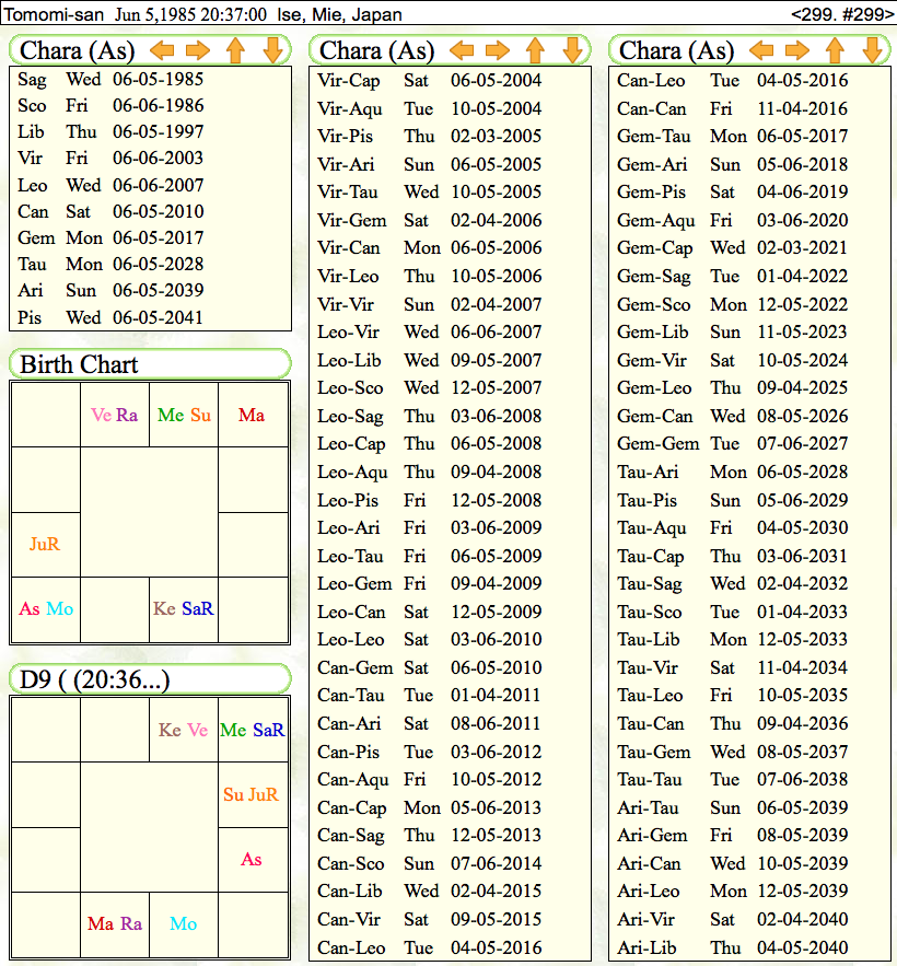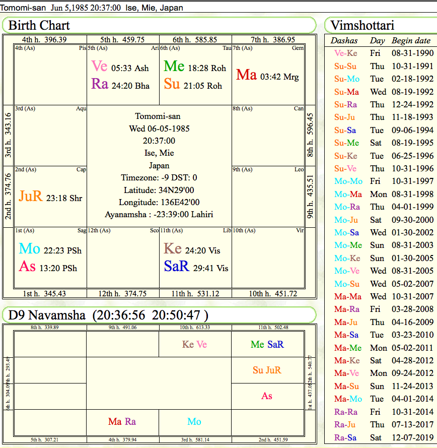 >ヴィムショタリーダシャーから見ますと、2012年の9月ごろから、1年ぐらいが結婚やお付き合いの相が見えます。火星ー金星期であり、ナヴァムシャでは1-7という位置で結婚・対人関係の相です。また、金星は結婚や恋愛関係の象意を持ちます。2014年4月ぐらいからもその次に結婚的な相に見えます。火星ー月期で、出生チャートでは1-7の位置です。ナヴァムシャでは1-12なので、どちらかといえば2012年9月から1年間のほうが、その相が強めに伺えます。もう少し前の2012年4月ぐらいからも、火星・ケートゥ期で1-7の相ですから、その傾向にも見えます。しかし、「現在結婚して仕事をやめました」ということからすると、ごく最近ということでしょうか。ラーフ・ラーフ・ケートゥ期ということでことしの5月ごろからも1-1-7という配置で結婚の相かもしれません。