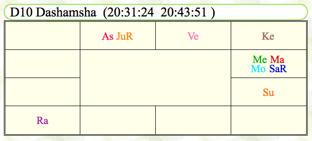 >>・ラーフは、出生チャートでは5室に、ナヴァムシャでは4室に在住します。D10では9室です。5室は教育・学びなどに良い位置です。4室は家庭や土地とのつながり。9室はラッキーで精神性の向上に良い時期です。ラーフは突然の変化や、アップダウンの波、これまでと異質な世界、外国などの象意がありますので、一定程度、外国とのつながりも生じやすいのかもしれません。