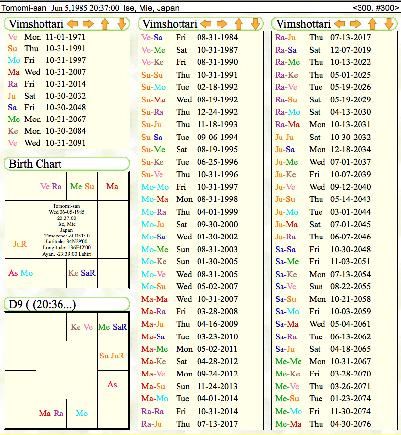 >>・現在はラーフ・ラーフ期であり、ラーフの象意である外国の縁とか突然の変化などが強まる時期に伺えます。次のラーフ・木星期は、2017年7月から2年強ですが、その時期は、ラーフから木星は、出生チャートでは1-10で仕事面の力が来る流れで、ナヴァムシャでは1-9で、精神性の向上や、大きめの移動・巡礼などの相と言えるかもしれません。D10においては、1-5で学びに良い相と見えます。