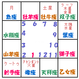 記号を使うと、左図のようになります。ここには、星座、ハウス(番号)、惑星というホロスコープを構成する要素すべてが盛り込まれております。