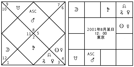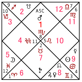 黒い小さな数字は、星座を表わしています。牡羊座から順に連番を振ったものです。牡羊座は1、牡牛座は2、双子座は3、・・・、魚座は12となります。 これまでに図説してきた南インド方式と北インド方式のホロスコープから、不必要な情報を削除してすっきりさせると、下図のようになります。これがインド占星術のホロスコープの最終的なフォーマットです。