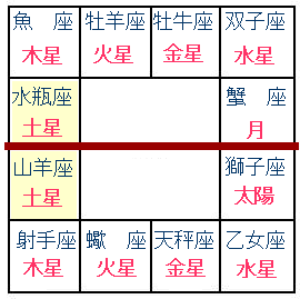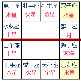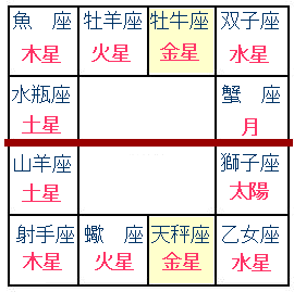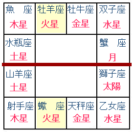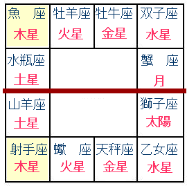 これは星座を支配する惑星をまとめた表ですが、チャートを解読するときには、星座の支配星を、その星座に対応するハウスの支配星としても見なします。 |